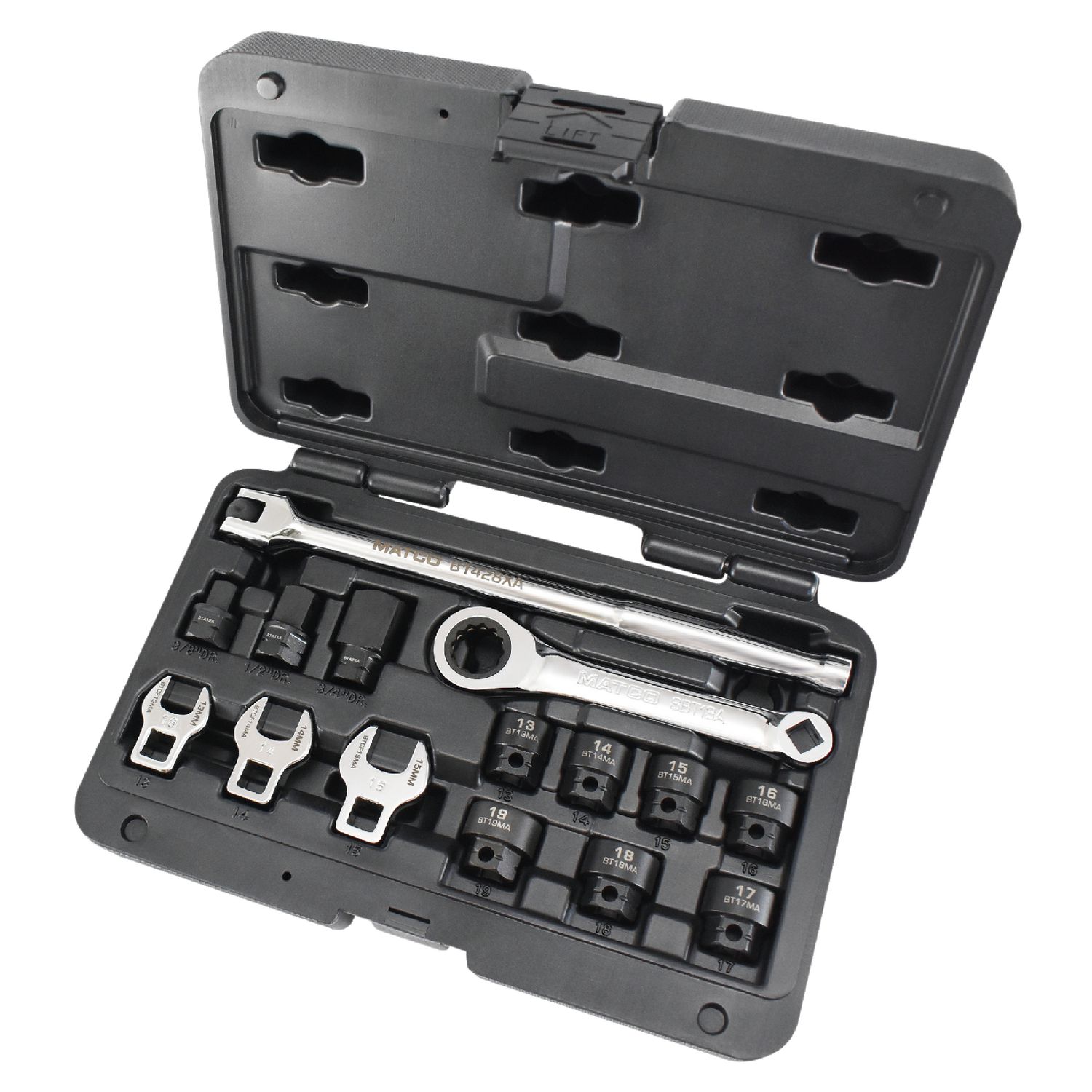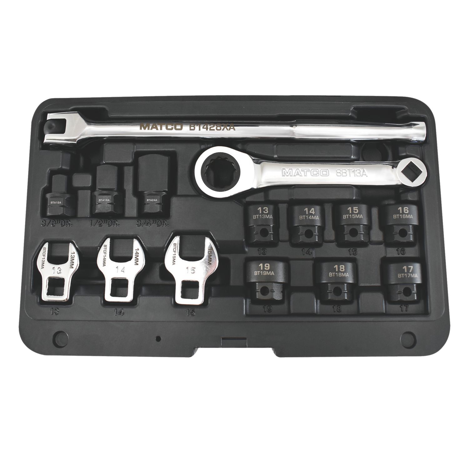 Includes 72 tooth ratcheting wrench, 10\” flex head 3/8\” breaker bar and 13 pieces that lock into the wrench: 13, 14, 15, 16, 17, 18 and 19mm low profile sockets, 3/8\”, 1/2\” and 3/4\” square drive adapters and 13, 14 and 15mm crowfoot wrenches