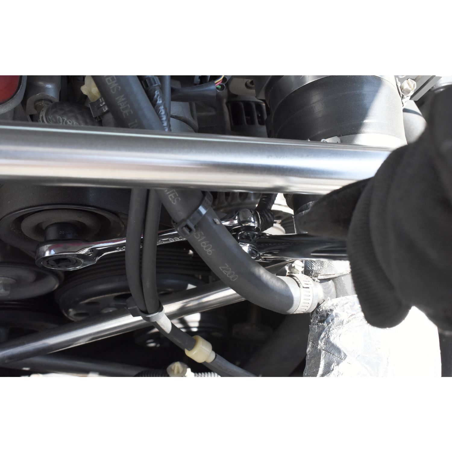 Low profile ratcheting wrench with 3/8\” breaker bar and attachments reach even the most confined belt and tensioner applications