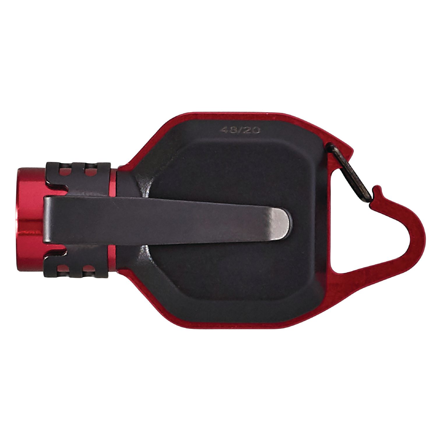 Spring-loaded clip with carabiner shape hangs cleanly on key rings, zippers, lanyards, etc.