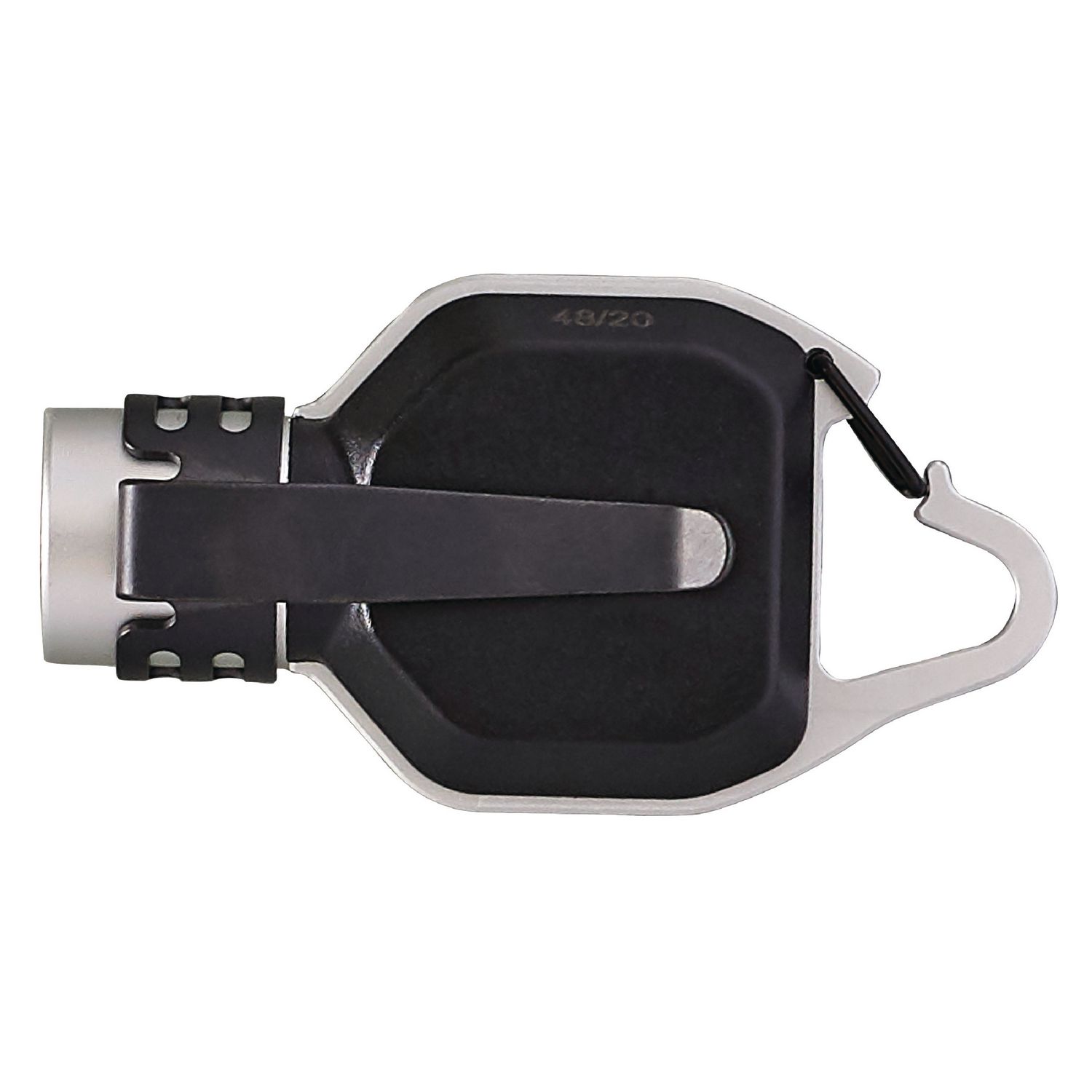 Spring-loaded clip with carabiner shape hangs cleanly on key rings, zippers, lanyards, etc.