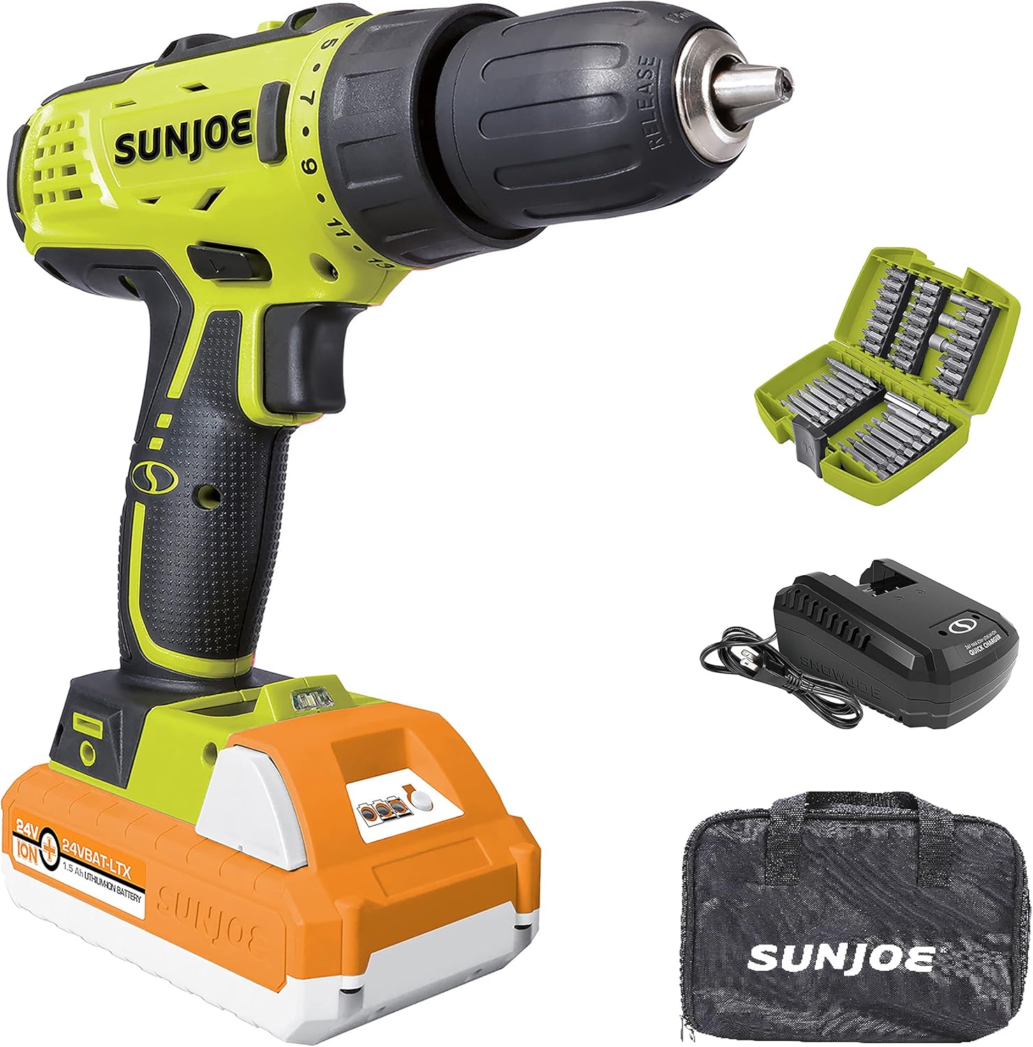 11 reviews for Sun Joe 24V-DDK-LTX 24V IONMAX Cordless 2-Speed Drill Driver Kit, w/ 1.5-Ah Battery & Charger, Magnetic Screw Tray, Built-in Bubble Level, and more, 265 In-Lbs Torque, 24-Positions, Green