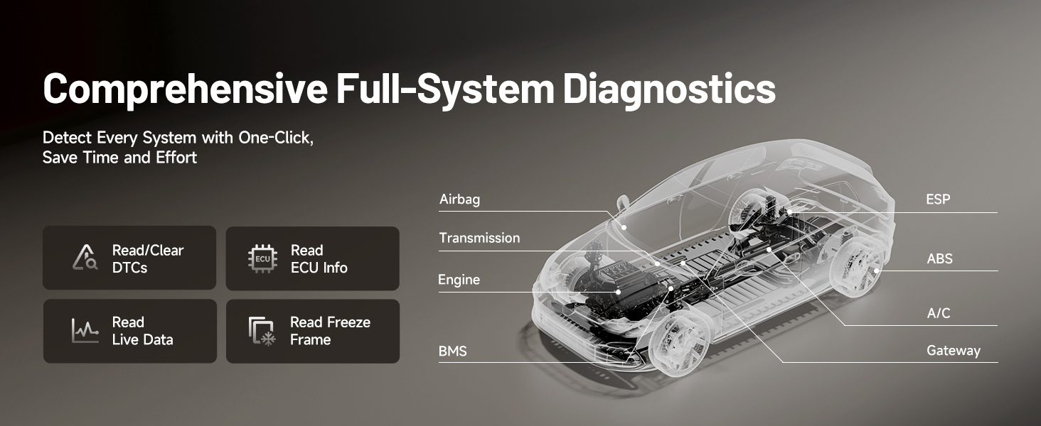 Scan Every System, Diagnose Faster Anywhere: This Bluetooth OBD2 car scanner delivers comprehensive full-system diagnostics, giving you OE-level access to every vehicle module, from the engine and transmission to ABS, A/C, and beyond. With its wireless portability, technicians can perform reliable repairs on-site or in the garage, right from their phones