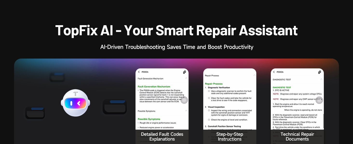 TopFix AI Assistant Simplifies Complex Repairs: TopFix AI enhances diagnostic efficiency by interpreting fault codes and producing detailed, step-by-step repair procedures. Supported by professional repair documentation, including comprehensive wiring diagrams and connector pinouts, both new and experienced technicians can handle complex repairs with confidence