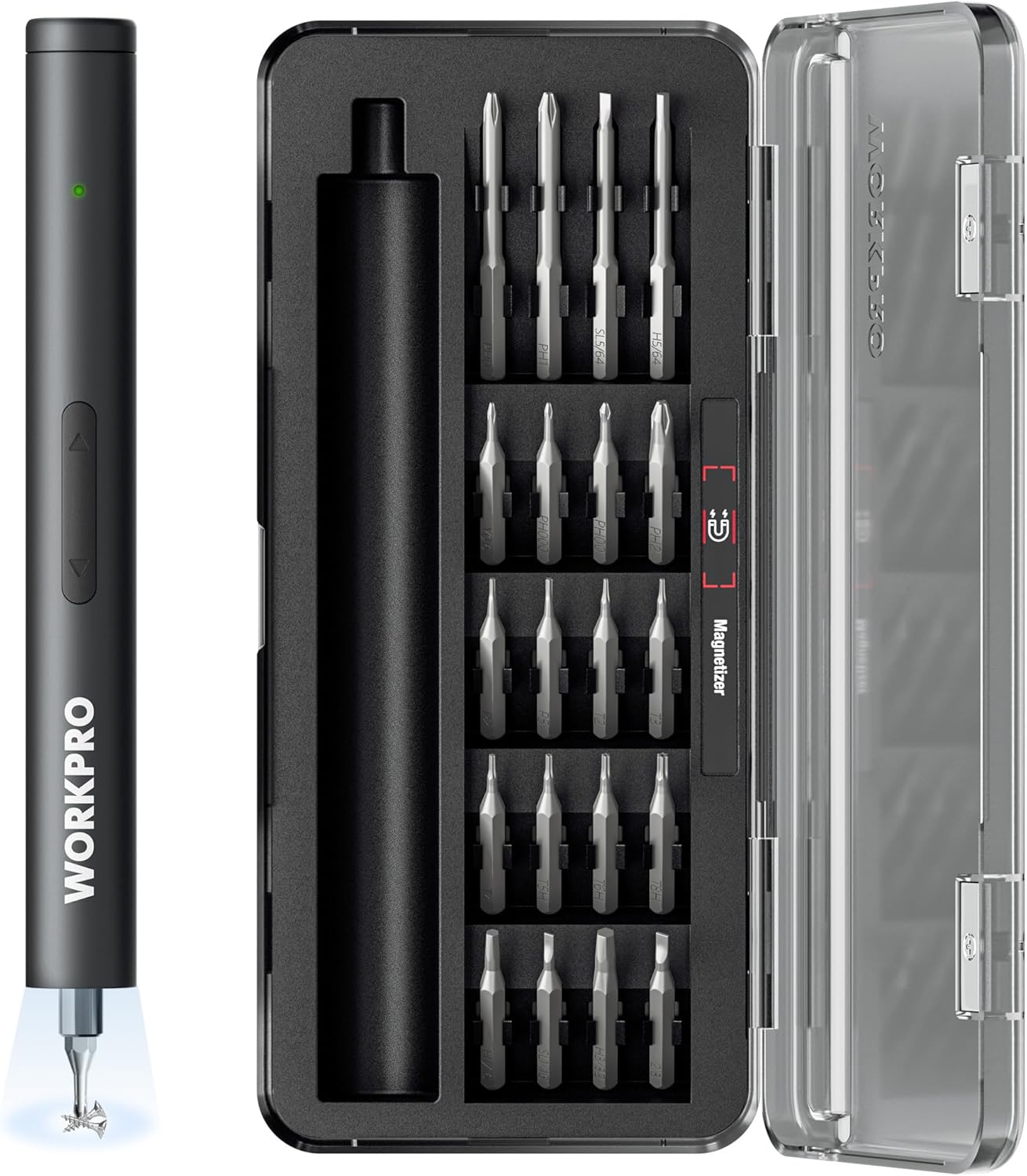 This is a very decent little electric precision screwdriver kit. Not the best I’ve seen, but better than many of them. I really like the Workpro brand of budget tools, and own quite a few of them. For the money they more often than not are of good quality. When I saw this electric screwdriver set, I had to order it.As with most electric screwdrivers in this class and price range, you don’t get a lot of torque. However for most precision screwdriver jobs, you don’t want a lot of torque. You’re usually dealing with tiny fasteners, sometimes directly threaded into plastic, so excess torque is a bad thing. I’m okay with using manual hand torque beyond what the screwdriver can deliver.The screwdriver itself is USB-C rechargeable, with an included USB-C to USB-A charging cable. It’s single speed/torque only, with an easy to manipulate forward/reverse switch. It’s constructed of aluminum with a greenish tint, and looks and feels very nice in the hand. When running it also has an illumination feature with 4 LEDs to light up the working area.The kit ships in a very nice hard plastic case with smoked translucent lid. Compared to other cases for similar tools, it’s very well made, with a metal hinge pin and magnetic closures. The bit storage area is not magnetic, however, but rather snaps into place between little fingers. I’d have preferred magnetic storage here as the little fingers can take some force if the bit isn’t turned perfectly, and can tend to snap off with usage. You get 20 S2 steel bits total,16 28mm bits and 4 longer 45mm bits. The case includes a magnetizer section and the bits magnetize quite well.Overall, like most things from Workpro, I’m very satisfied with this screwdriver kit and consider it an overall good value. Just know it’s intended purpose and don’t expect a lot of torque.
