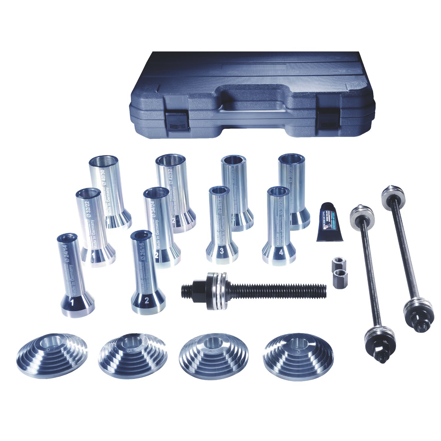 Universal tool set for extracting and mounting silent bearings, hydraulic bearings, ball bearings, rubber bearings, shaft seals, bearing bushes and more