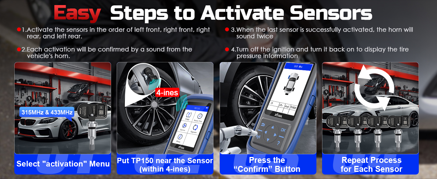 Is it for all sensors for all cars?–TP150 cannot work for all sensors but only pre-programmed sensors or XTOOL sensors, only sensors are right and it can work for your cars.Not Compatible? Does not work for my vehicles? –Please note that TP150 ONLY Works for programmed OE or aftermarket sensors or XTOOL Sensors. If you need Sensor programming/activation/relearn/diagnosis/read, all should be based on this compatibility note.Compatibility List Checking: First please make sure that TP150 only works for programmed sensors and XTOOL sensors and then Check vehicle compatibility from “xtoolonline-Support-Vehicle Coverage-TPMS” or XTOOL Tech Service: xtooldirect outlook c0m. Make sure OE part number are compatible. Vehicles Brand covered for GM, for Toyota, for Dodge, for Honda, for Jeep, for Ford, for Nissan, for Chevrolet/for Chevy, for BMW, for Hyundai, for Ram, for Subaru, for Lexus, for Mercedes-Benz, for Kia, for Mazda, for GMC, for Infiniti, for Chrysler, for Audi, for Porsche, for Volvo, for Land Rover, for Scion, for Cadillac, for Buick, for Mitsubishi, etc. My sensor is OEM and pre-programmed, TP150 cannot work. Why? –The new sensors should be correct which must have the same part number as the original vehicle’s sensor. For instance, for a 2016 Toyota Tundra, if yours is 2021 OEM sensors but not the same part number, it cannot work because it’s not the right sensor. Please get the right OE sensors; Another way is to choose XTOOL sensors.