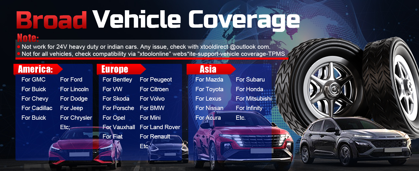 TPMS Relearn Tool for GM from 1996-2024: for Buick Allure 2006-2015, for Cascada 2016-2020, for Century 1999-2005, for Enclave/for Equinox 2007-2024, for Encore 2013-2024, etc. for Chevrolet Avalanche 2004-2013, for Camaro 2009-2024, for Silverado 2000-2024, etc. for GMC/for Opel/for Cadillac, etc. TPMS Relearn Tool for Ford from 1996-2024: for E-Series 2007-2024, for F-Series 2006-2024, for F150, for F250, for Edge, for Escape, for Focus, for Mustang, for Fusion, for Expedition, for Explorer, for Transit, for Lincoln, for Mercury, for Mazda, etc. Sensors should be original OEM sensors which well programmed or choose XTOOL Sensors