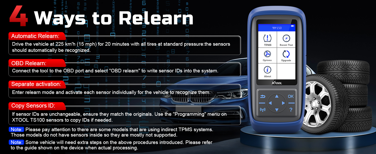 TPMS Reset Tool for Programmed Sensors: Works as a professional Tire sensor reset tool, XTOOL TP150 offers 4 ways to relearn 99% TPMS sensors: OBD Relearn, Stationary Relearn, Manual Relearn, Copy Relearn, provides online relearning procedure for most American, Asian and European vehicles equipped with TPMS. Help to save money for drivers who owns multiple cars and get a tire issue fast solved for tire shops. Note: Some vehicles can automatically relearn after driving 20 minutes, please check from vehicle manual. If sensors have issues. it will be not reset successfully