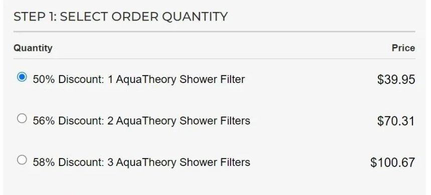 This website sells shower heads. It's a single-page website, and the prices are as follows: one shower head costs $39.95, two cost $70.31, three cost $100.67, and four cost $127.84.